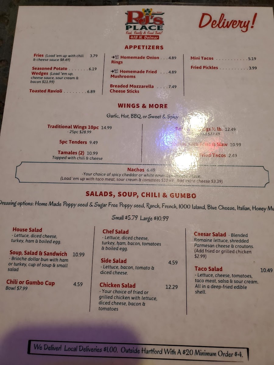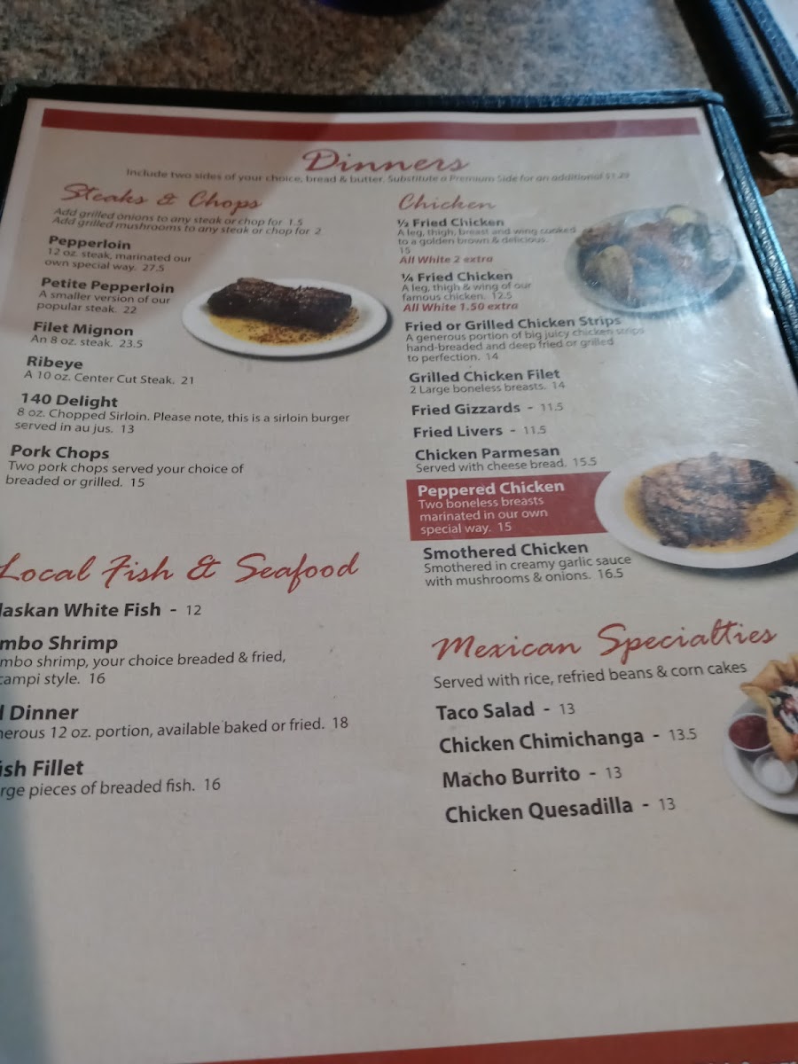 You’ll find classic dishes like the Chicken Fried Chicken Dinner and the Tenderloin Sandwich alongside comforting seafood options such as the Alaskan White Fish with homemade chips and mac and cheese. For lighter fare, salads like the Caesar or Taco Salad offer a fresh balance to the menu’s richer selections. The variety also extends to shareable family meals and pizzas, including a Supremo-style pizza loaded with toppings and the layered Stromboli for those who enjoy sturdy, flavorful portions.